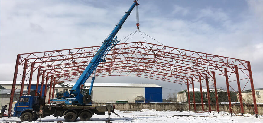 Когда все модули собраны, осуществляется их подъем и установка на опорное основание. Благодаря небольшому углу ската, конструкции легки и экономичны в монтаже.